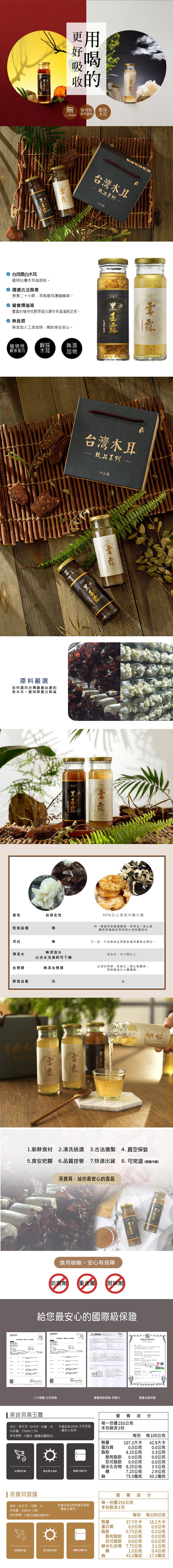 嚴選優質台灣銀耳、黑木耳,原料全程-5°C運送,歷時十二小時熬煮萃取,精心熬製出兩款經典飲品,「雲露」與「黑玉露」,讓您一次享受木耳的極致美味與豐富營養。